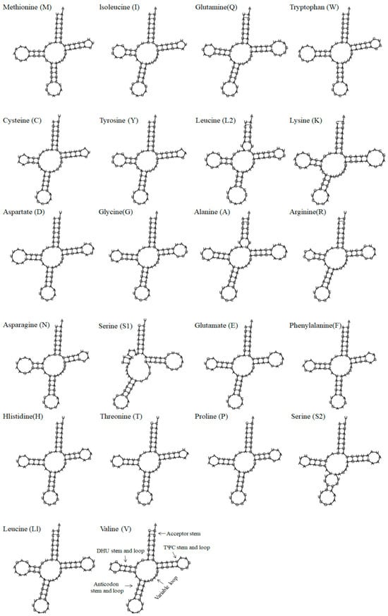 - Lowe, T.M.; Eddy, S.R. tRNAscan-SE: A program for improved detection of transfer RNA genes in genomic sequence. Nucleic Acids Res. 1997, 25, 955–964. [Google Scholar] [CrossRef] [PubMed]
