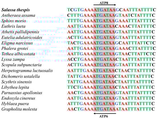 There is always a 7 bp overlapping region between the 3’ end of atp8 and the 5’ end of atp6 in insect mitochondrial genomes. In Diptera, Grylloblattodea, Megaloptera and Raphidioptera, the overlapping region is ATGATAA [,,]. In Lepidoptera, except for Micropterigoidea, where this overlapping region is ATGATAG, the other species are ATGATAA, and the S. thespis was also ATGATAA. However, in Hymenoptera, there are even five types in this region [,].