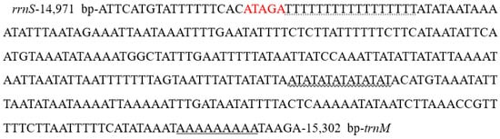 The length of the A + T-rich region (control region, CR) of S. thespis mitochondria was 331 bp, starting from 14,972 bp to 15,302 bp, and was located between the rrnS and trnM genes (Table 3). Compared with other regions of the S. thespis mitochondrial genome, the AT content in the CR was as high as 90.33%, and the AT skewness and GC skewness in this region were −0.07 and −0.19, respectively (Table 4). Like most Lepidopterans [,], some conserved motifs were found in the CR of the S. thespis mitochondrial genome, including a 17 bp poly-T guided by “ATAGA”, the AT-rich area and a poly-A element. The “ATAGA” sequence was located at the beginning of the CR, near the 5’ end of 12S rRNA (Figure 5). The “ATAGA” motif is usually considered to be the precise location of the origin of replication, and the poly-T sequence is considered to be the structural signal for protein recognition in the initiation of replication [].