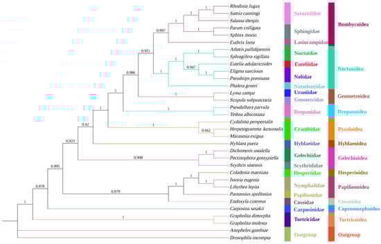 BI phylogenetic trees of Lepidoptera species based on the protein-coding genes. Numbers above each node indicate Bayesian posterior probability values [].