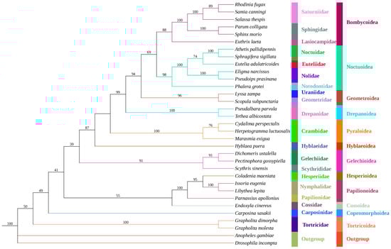 ML phylogenetic trees of Lepidoptera species based on the protein-coding genes. Numbers above each node indicate ML bootstrap values [].