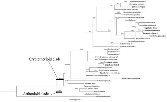 The topology of the phylogenetic tree, divided into the Arthonioid and Cryptothecioid clades, was largely congruent with that of earlier studies [19,20]. All species of Herpothallon and Crypthothecia belong to the Cryptothecioid clade. The newly identified Herpothallon specimens formed a single clade, represented by a bootstrap support of 100 and a posterior probability of 1 for the branch (Figure 1). Based on the differences in phylogeny and morphology compared to other species, which are described in detail below, it is classified as a new species named Herpothallon fibrosum (refer to Taxonomy below). The new record, Cryptothecia striata, is phylogenetically close to C. subnidulans, the type of the genus; they all have gray thallus and 1-spored asci, but C. striata exhibit radiating ridges on the thallus and contain gyrophoric acid and lecanoric acid as secondary metabolites, which distinguish it from C. subnidulans [9,27].