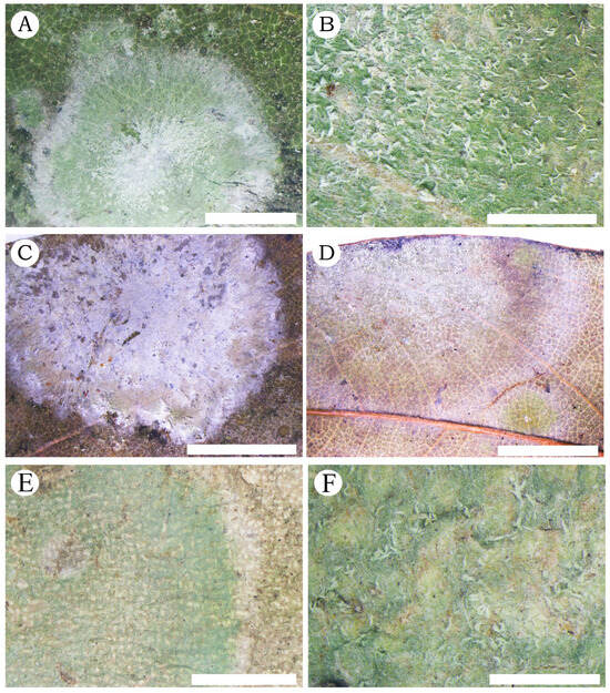 Herpothallon fibrosum (A,B) Thallus and pseudoisidia of fresh foliicolous specimen (20220088); (C,D) Thallus of foliicolous specimen after storage ((D): hypophyllous thallus) (20220088); (E,F) Thallus and pseudoisidia of fresh corticolous specimen (20220077) Scale bars: 2 mm (A); 800 µm (B); 3 mm (C); 4 mm (D); 3 mm (E); 500 µm (F).