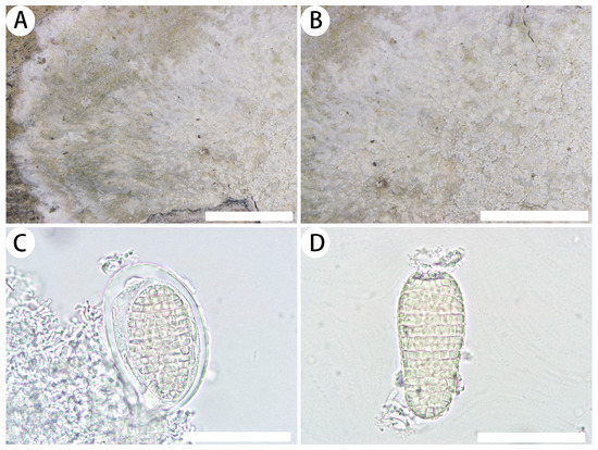 Cryptothecia striata (SDNU 20231073). (A) Thallus and prothallus. (B) Ascigerous areas. (C) Ascus. (D) Ascospores. Scale bars: 2 mm (A,B); 50 µm (C,D).
