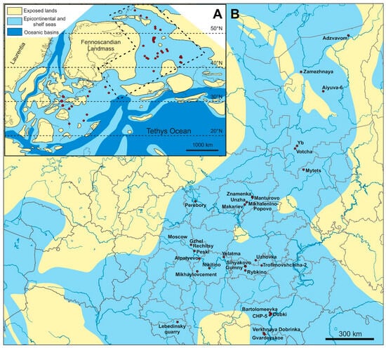 Localities of known marine reptile fossils from the Callovian of European Russia shown by red asterisks (B). Blue colorations on the map show outlines of the Middle Russian Sea during the Callovian, based on []. The upper left (A) shows Callovian paleogeography of Europe (after []; modified according to the data of [,]), with red dots showing the main localities of Callovian marine reptiles in Europe (i.e., numerous localities with the Oxford Clay Formation in England [,,,,,,,,], localities in Northern and Southern France [,,,,,,,,,,], Spain [], Switzerland [], Northern Germany [,,,,], and Poland [,]). Dashed contour on (A) shows the area depicted in (B).