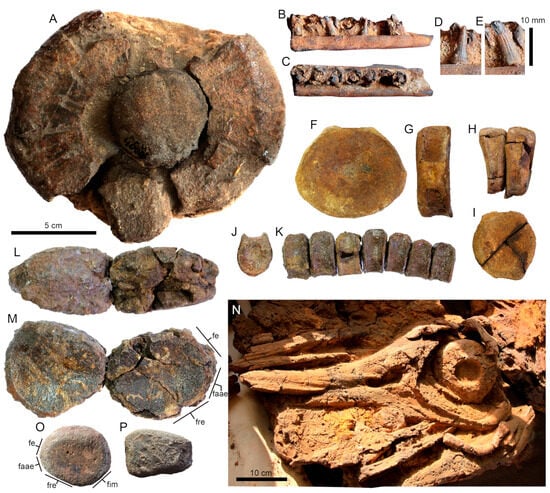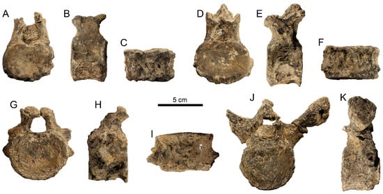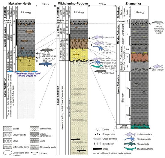 To the south, in the lower-middle reaches of the Unzha River Basin [,,,] (and D.G.’s unpublished data; see Figure 2), reptile remains can be associated with condensed sandy and sandy-clayey deposits of the lower Callovian (upper part of Paracadoceras elatmae, Proplanulites koenigi, and Sigaloceras calloviense zones), as well as to the disconformity between the middle Callovian and middle Oxfordian [], and condensation sometimes covering the stratigraphic interval from the top of the Kosmoceras jason Zone to the bottom of the Cardioceras densiplicatum Zone.