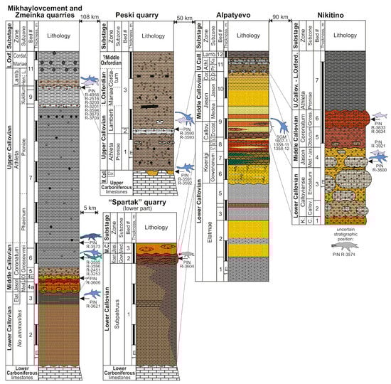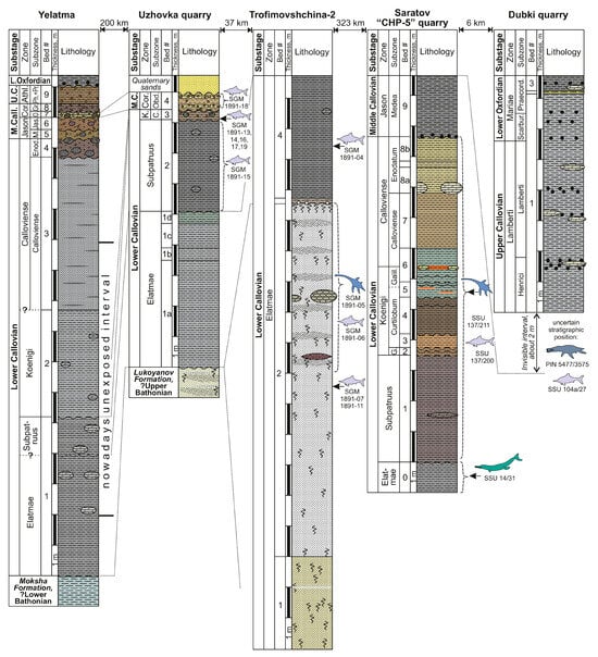Stratigraphic sections of the Callovian marine reptile localities in Ryazan and Nizhny Novgorod regions, Republic of Mordovia, and Saratov Region. For lithology and other symbols of the legend, see Figure 2. Abbreviations of ammonite zones and subzones: Athl, Athleta; C, Curtilobum; Call/Callov, Calloviense; Cor, Coronatum; Enod, Enodatum; G, Gowerianum; Galil, Galilaeii; Gr– Grossouvrei; Jas, Jason; K, Koenigi; M, Medea; O/Obd, Obductum; Ph, Phaeinum; Pr, Proniae; Praecord, Praecordatum; Scarbur, Scarburgense. Yelatma locality section modified after [,,]; Uzhovka and Trofimovshchina-2 originally drawn herein based on A.I.’s field descriptions; CHP-5 after []; Dubki after [,].