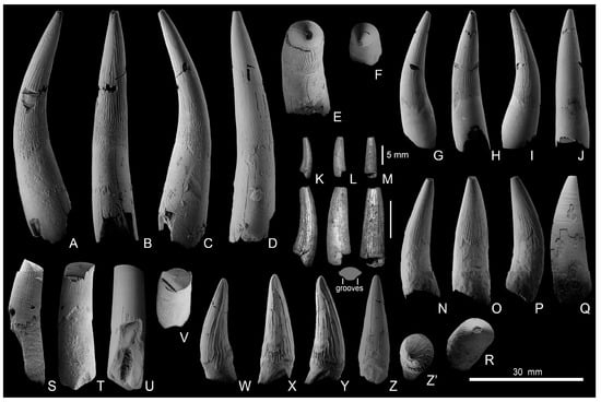 - Repin, Y.S.; Zakharov, V.A.; Meledina, S.V.; Nalnyaeva, T.I. Atlas of the mollusks of the Pechora Jurassic. Bull. VNIGRI 2006, 3, 1–262. (In Russian) [Google Scholar]