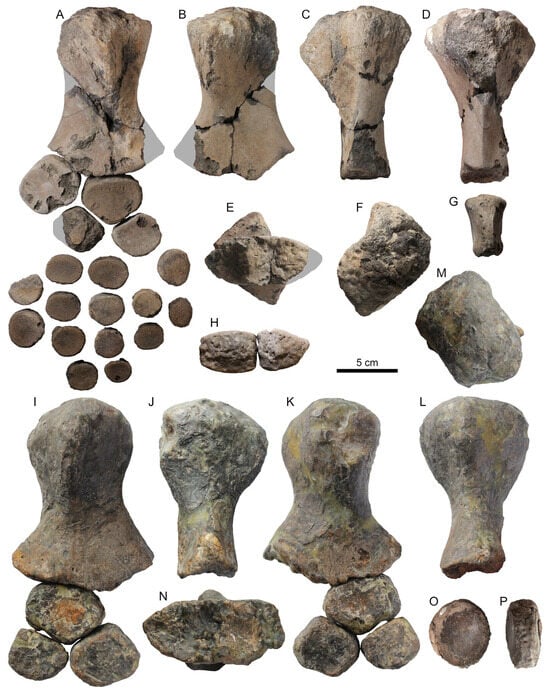 The earliest reports of marine reptile finds, probably from the Callovian Stage of European Russia, were made by Riabinin [] and Bogolubov []. Riabinin described a pliosaurid bone association from the condensed upper Callovian and lowermost Oxfordian deposits of the Unzha River, near Gradulevo Village (currently part of Manturovo Town) in the Kostroma Region []. This specimen, now kept in the Mining Museum, St Petersburg (MM 219), was referred to Peloneustes; however, it was later re-considered as Pliosauridae indet. []. Bogolubov [] described a new species, Cryptoclidus simbirskensis, from Gorodischi, Simbirsk Province (currently Ulyanovsk Region). This taxon was later considered Plesiosauria indet. [,]. The bones of “Cryptoclidus simbirskensis” were collected ex situ; therefore, their precise stratigraphic position is uncertain. Their state of preservation and color of the matrix occurs in the Callovian–lower Volgian interval of the region, although near Gorodischi the Callovian deposits are unknown. Bogolubov referred the specimen to the Callovian genus Cryptoclidus, based on its anteroposteriorly short cervical vertebrae with concave articular surfaces []. Therefore, the suggestion that this specimen is of Callovian age was the result of its taxonomic referral, not vice versa. Considering the presence of other cryptoclidids with similar morphology of cervical centra and propodials in stratigraphically younger deposits of the Arctic (i.e., Djupedalia [] and an indeterminate cryptoclidid from Greenland []), we tentatively consider Cryptoclidus simbirskensis a nomen dubium, interpret its age as uncertain within the Callovian to lower Volgian interval, and exclude it from further consideration in our work.
