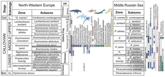 - Kiselev, D.N.; Rogov, M.A. Detailed biostratigraphy of the Middle Callovian–lowest Oxfordian in the Mikhaylov reference section (Ryazan region, European part of Russia) by ammonites. Vol. Jurass. 2018, 16, 73–186. [Google Scholar] [CrossRef]