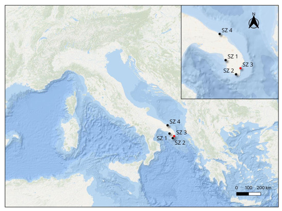 Sampling stations along the Salento peninsula. SZ 1—“Chiapparo”, Santa Caterina, Lecce (40°08′28.2″ N 17°58′46.1″ E); SZ 2—“Torre Vado”, Morciano di Leuca, Lecce (39°49′46.3″ N 18°16′38.6″ E); SZ 3—“Grotta Verde”, Marina di Andrano, Lecce (39°57′48.1″ N 18°24′18.2″ E); SZ 4—“Torre Guaceto” M.P.A., Brindisi (40°42′48.2″ N 17°48′30.5″ E).