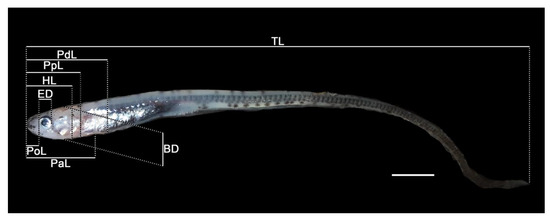 After the dissection of the sea cucumber and the isolation of the pearlfish specimens, the latter were weighed with a Napco Ja-210 precision electronic balance and measured with a ruler. Eight morphometric measurements were evaluated: total length (TL), body depth (BD), head length (HL), eye diameter (ED), pre-orbital length (PoL), pre-pectoral length (PpL), pre-dorsal length (PdL), and pre-anal length (PaL) [35] (Figure 2).