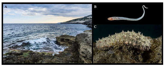 (A) “Grotta Verde” in Marina di Andrano (LE) (SZ3); (B) Carapus acus individual from SZ3; (C) Holothuria tubulosa from the studied area.