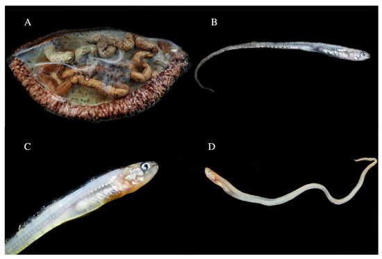(A) The tenuis larvae of Carapus acus found in the holothurian with code A10; (B–D) Juvenile specimens at different stages.