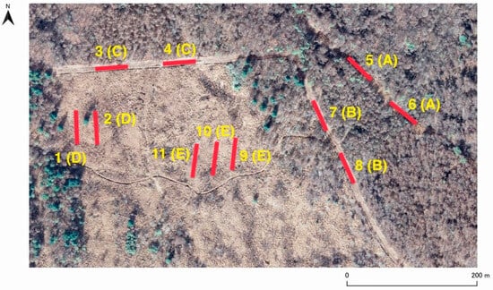 The study area is located in a grassland and woodland area (980 m a.s.l.) at the northwestern foot of Mt. Fuji, central Japan (35°26′54″ N, 138°36′46″ E). The terrain in this area is almost horizontal, but has irregular undulations with an elevation difference of about 8 m. The surface layer of this area is composed of scoria-like lava and volcanic ash resulting from past volcanic eruptions in the Mt. Fuji area. The study area consists mainly of landscapes such as grasslands, forests, and firebreak belts at the edges (Figure 1).