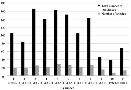 In the present study, we recorded a total of 1226 individuals of 48 butterfly species during the whole study period. The annual total number of individuals in each transect in all butterfly species recorded (corresponding to response variables) is shown in Appendix A. The two community parameters (the total numbers of species and individuals) in each transect are shown in Figure 2.