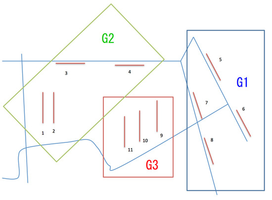 The positional relationship between the three groups (G1, G2, and G3) identified by the MRT analysis and the transects belonging to the respective groups. The numbers show each transect. Light blue lines indicate paths.