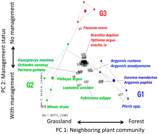 The groups (G1, G2, and G3) identified by MRT in Figure 3 and the 48 butterfly component species were plotted jointly in a PCA biplot (Figure 5). The first axis of the PCA explained 42.6% of the total community variation (Table 2), mainly separating the communities surrounded by forests from those surrounded by grasslands. The second axis of the PCA explained 36.1% of the variation (Table 2), mainly separating the communities associated with management from the communities with no management. The first two axes of the PCA accounted largely for 78.8% of the variance in the community. The group G1 discriminated by MRT was distributed on the right side of the first axis (forest-oriented), and the other groups (G2 and G3) were distributed on the left side of the first axis (grassland-oriented). On the other hand, group G3 was distributed on the upper side of the second axis (no management-oriented), and the other groups (G1 and G2) were distributed on the underside of the second axis (with management-oriented). Thus, the PCA also distinctly separated the three groups discriminated by MRT. Pieris spp., Eurema mandarina, Argynnis paphia, Argynnis ruslana, and Argynnis anadyomene were characteristic species of group G1 and are not Red Listed species (Table 3). Minois dryas, Leptalina unicolor, Fabriciana adippe, Plebejus argus, Parnara guttata, Ochlodes venatus, and Gonepteryx maxima were characteristic species of group G2, three of which (L. unicolor, P. argus, and G. maxima) are Red Listed species (Table 3). Fixsenia mera, Brenthis daphne, Ypthima argus, and Inachis io were characteristic species of group G3, one of which (Brenthis daphne) is a Red Listed species (Table 3). According to Figure 2 and Figure 5, the number of butterfly component species was higher in groups G1 and G2 than in group G3.
