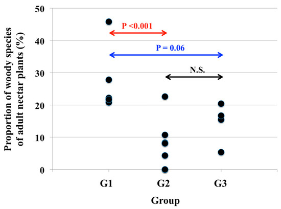 The results of the Tukey test for comparisons among the mean proportions of woody species of adult nectar plants in the characteristic species of the three groups (G1, G2, and G3) identified by MRT analysis.