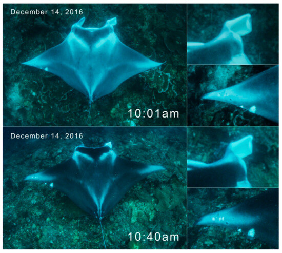 - Ari, C. Rapid coloration changes of manta rays (Mobulidae). Biol. J. Linn. Soc. 2014, 113, 180–193. [Google Scholar] [CrossRef]