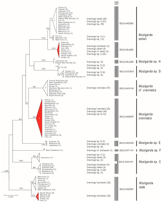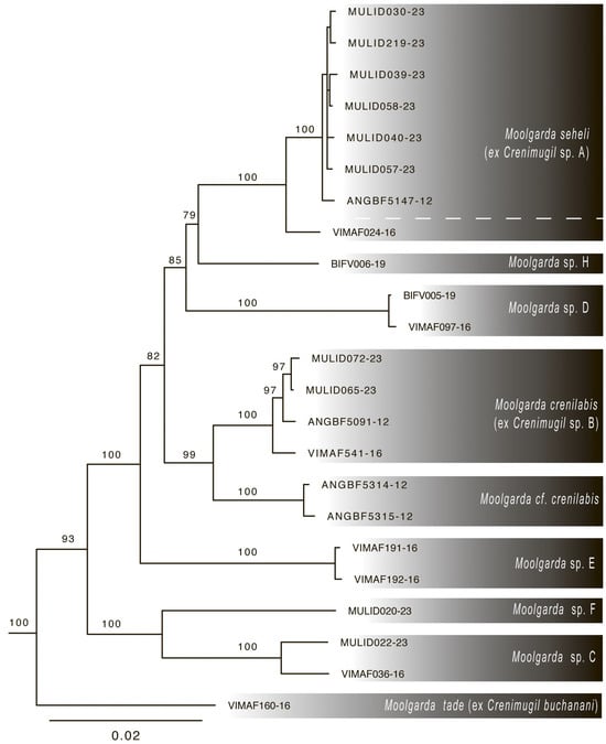 The Mugilidae is a family of shallow-water fishes distributed in tropical and temperate seas circumglobally. They typically inhabit marine or brackish waters, but few species live in freshwater environments. For a long time, the classification of mugilid species has been chaotic, despite an effortful revision of the whole family by Thomson [], in which he included descriptions of 14 genera and 62 species. Later studies, based on molecular data, proposed numerous changes to the generic and species taxonomy [,,]. Currently, 72 species are recognized in 26 genera []. However, genetic data suggest that many cryptic species are present in all major mugilid clades [,]. Several recent studies have already contributed to a better understanding of mugilid phylogeny, systematics and taxonomy, especially by describing some of the cryptic species found in this family [,,]. This study presents further data, helping to unravel the taxonomic issues of mugilids. The genus name Moolgarda is revived for the clade containing nine lineages, three applied to described species M. crenilabis, M. seheli and M. tade, as well as one species with a doubtful affiliation, M. cf. crenilabis, and five putative species abbreviated in the present study as M. sp. C, M. sp. D, M. sp. E, M. sp. F and M. sp. H.
