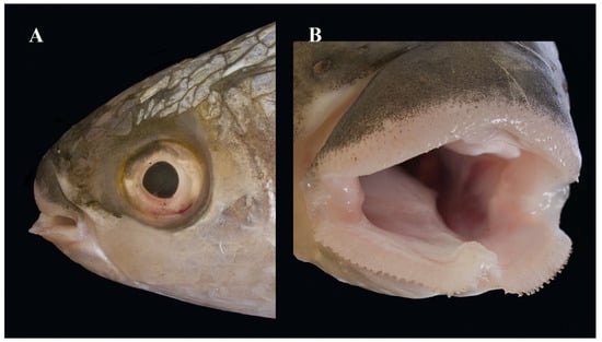 Aside from Moolgarda crenilabis, M. seheli and M. tade (previously recognized as Crenimugil buchanani), there was one other species recognized as valid within the genus Crenimugil: C. heterocheilos (Bleeker, 1855) []. Bleeker [] originally described the species based on specimens from Indonesia and noted its similarity to Mugil crenilabis and Mugil cirrhostomus. After Schultz [] created the new genus Crenimugil based on the distinctive characteristics of Moolgarda crenilabis, i.e., toothless lips, upper lip thick with margin bearing several rows of small papillae and margin of lower lip distinctly fringed, Roberts [] added the species Crenimugil heterocheilos to this genus because of its thick upper lip that bears rows of papillae. The latter differs from Moolgarda crenilabis in having rows of hard papillae laterally on the upper lip that are arranged in ridges and the edge of the lower lip not crenulated. Because of the strong resemblance of M. crenilabis and C. heterocheilos, the latter species is retained as valid in the genus Moolgarda herein (as Crenimugil in [,,]), yet at this point it remains unclear to which of the five unnamed evolutionary clades within the genus Moolgarda it can be assigned. Moolgarda heterocheilos is supposedly distributed in the Indo-West Pacific and ranges from Japan to New Caledonia and Indonesia to French Polynesia []. Two nominal species Mugil banksi Seale, 1910 (from the Philippines) and Mugil papillosus Macleay, 1883 (from Papua New Guinea) are currently placed in the synonymy with Moolgarda heterocheilos [,,].