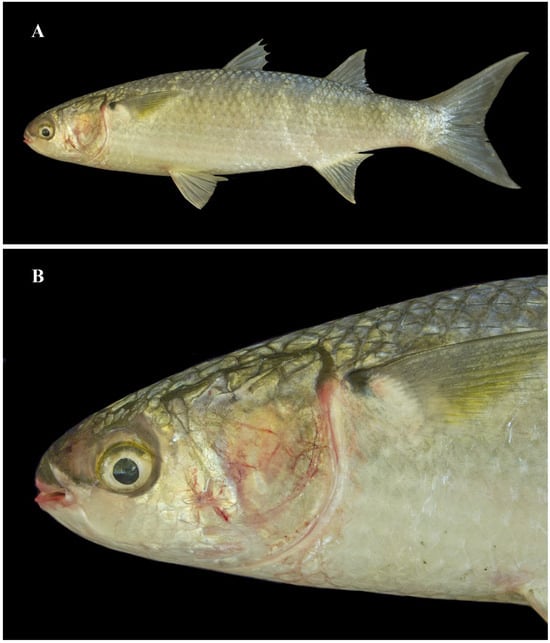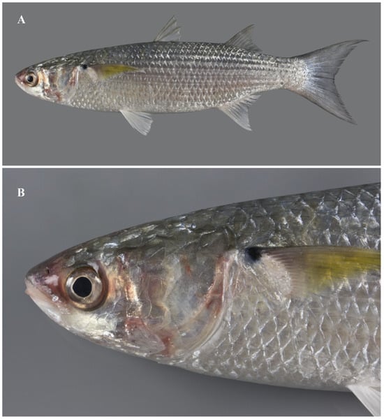 - Hasan, M.E.; Hasan, A.; Béarez, P.; Shen, K.N.; Chang, C.W.; Tran, T.T.V.; Golani, D.; Al-Saboonchi, A.; Siddiqui, P.J.A.; Durand, J.D. Planiliza lauvergnii (Eydoux & Souleyet, 1850), a senior synonym of Planiliza affinis (Günther, 1861) with a re-evaluation of keeled back mullets (Mugiliformes: Mugilidae). Zootaxa 2022, 5194, 497–518. [Google Scholar] [CrossRef] [PubMed]