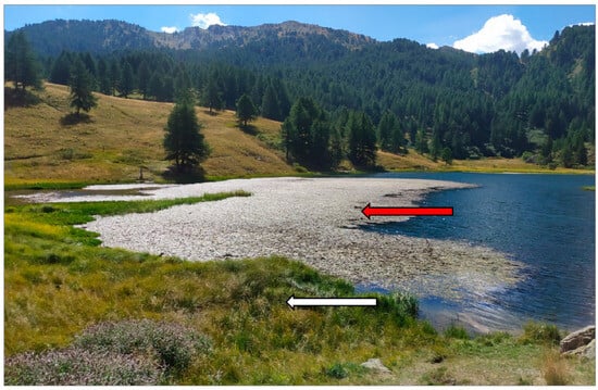 A view of the northern side of Nero Lake (Western Alps, Italy, 2020 m a.s.l.). A Potamogeton sp. population is indicated by a red arrow (from this perspective, Potamogeton nodosus and Potamogeton alpinus are indistinguishable). Marsh vegetation is indicated by a white arrow.