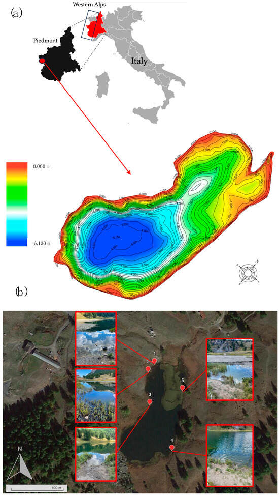 The presence of marsh vegetation is restricted to a narrow band of tall sedges, specifically Carex vesicaria (Linnaeus, 1753) and Carex elata (Allioni, 1785), which are often accompanied by Menyanthes trifoliata (Linnaeus, 1753) [31]. The scarcity of this vegetation is due to steep banks along the perimeter and excessive trampling by grazing and tourists [31]. Based on bathymetric surveys, five littoral sampling sites were identified for the analysis of physicochemical parameters and macrobenthic invertebrates, as shown in Table 1 and Figure 2. Two sampling campaigns were conducted, the first in July 2022 and the second in July 2023.