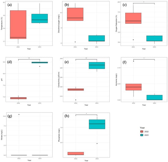 Box plots of (a) water temperature, (b) dissolved oxygen concentration, (c) oxygen saturation*, (d) pH*, (e) conductivity*, (f) ammonia concentration*, (g) nitrate concentration, and (h) phosphate concentration* in Nero Lake (Western Alps) in July 2022 and July 2023. Asterisks indicate significance (p-value < 0.05).