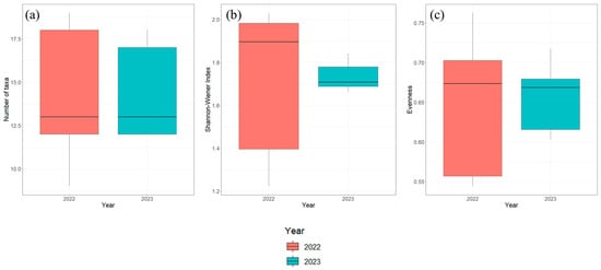 Box plots of (a) number of taxa identified, (b) Shannon–Wiener Index, and (c) Evenness for macrobenthic community in Nero Lake (Western Alps) in July 2022 and July 2023.
