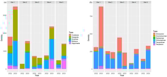 Density of (a) main identified taxa of macrobenthic invertebrates and density of (b) main identified taxa of Diptera Chironomidae in Nero Lake (Western Alps) in July 2022 and July 2023.