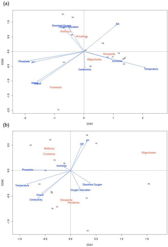 The CCA revealed some groupings of macroinvertebrate taxa according to environmental variables, as shown in Figure 6. In 2022, Mollusca and Hirudinea exhibited an association with dissolved oxygen and silt. In contrast, Crustacea were associated with gravelly substrates and the presence of nutrients (nitrates and phosphates). Finally, Hexapoda and Oligochaeta were associated with the presence of dissolved ammonia, higher temperatures, and conductivity. In 2023, Mollusca and Crustacea were influenced by the amount of dissolved nutrients in the water (ammonia and phosphates) and were associated with silt and higher values of pH. Oligochaeta were apparently associated with silt and higher pH values. Hexapoda and Hirudinea seemed to be associated with higher dissolved oxygen concentrations and gravelly substrates.