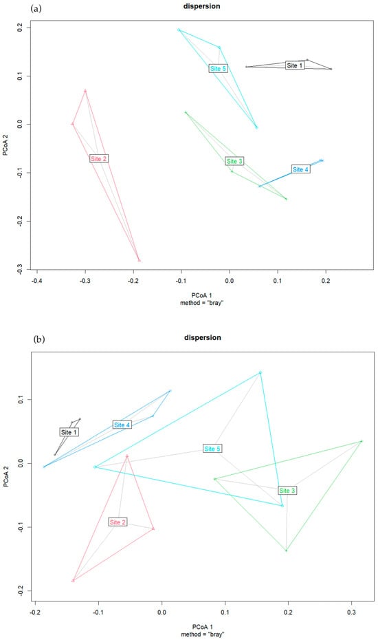 Principal coordinate analysis (PCoA) of species data in Nero Lake (Western Alps) using Bray–Curtis distance. (a) July 2022; (b) July 2023. Objects are sites, and distances quantify similarity in terms of species composition and abundance.