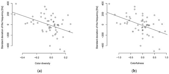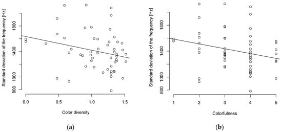 When viewed without the PIC, a similar picture was shown with a weak to moderate negative correlation between song complexity and body length or body mass (Table S9). The Pearson correlation showed only a weak (R ≥ 0.1–0.2) negative correlation with a tendency towards significance between the standard deviation of the frequency and plumage correlation (Figure 2, Table S9). The correlation between the interquartile frequency and color diversity was significant but weak (Table S9).