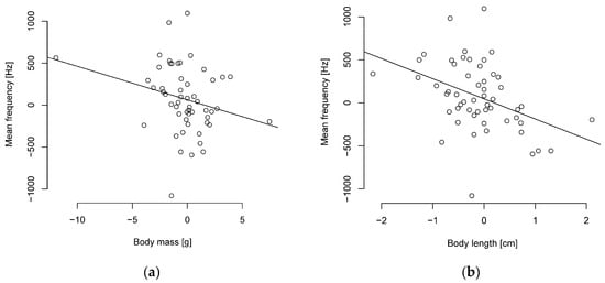 Phylogenetically independent contrasts between mean frequency and (a) body mass or (b) length are negatively correlated (n = 55 parid species).