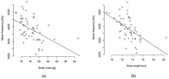 Mean frequency and (a) body mass or (b) length are negatively correlated (n = 55 parid species).