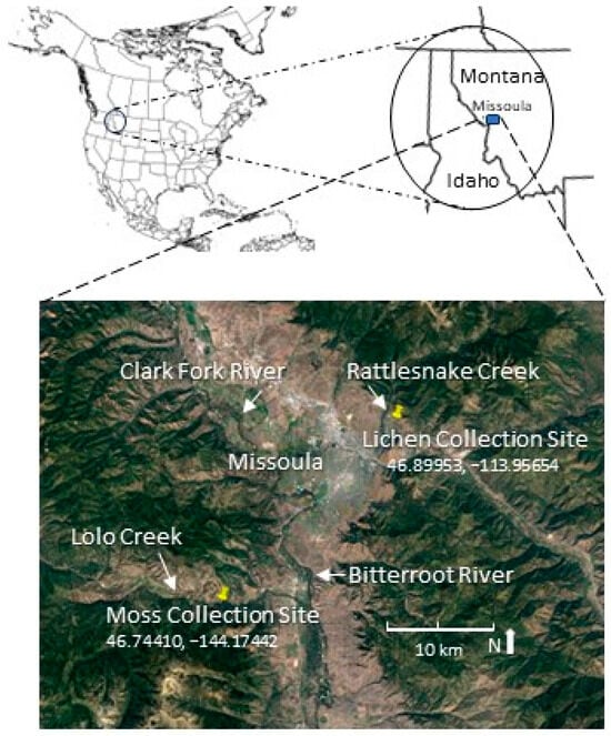 Location of moss and lichen collection sites in western Montana. Based on Natural Earth and Google Earth Pro maps and the images.