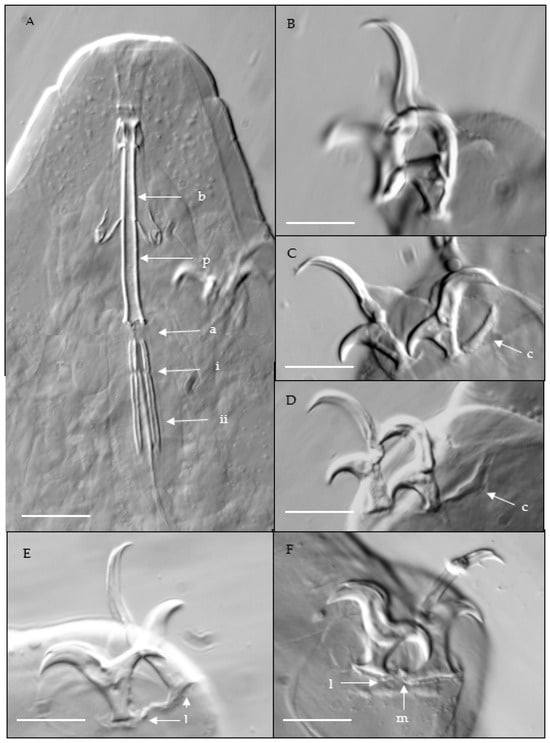 DIC images Platicrista loloensis nov. sp. (A) Buccal apparatus, a = pharyngeal cuticular bar, b = buccal tube, p = pharyngeal tube, i = first placoid, ii = second placoid (400×), (B) claws of leg I; (C) claws of leg II, c = internal cuticular bar; (D) claws of leg III, c = internal cuticular bar; (E) claws of leg IV, l = pseudolunule; (F) claws of leg IV, l = pseudolunule, m = median cuticular bar. (B–F) = 1000×, Scale bar = 10 µm.
