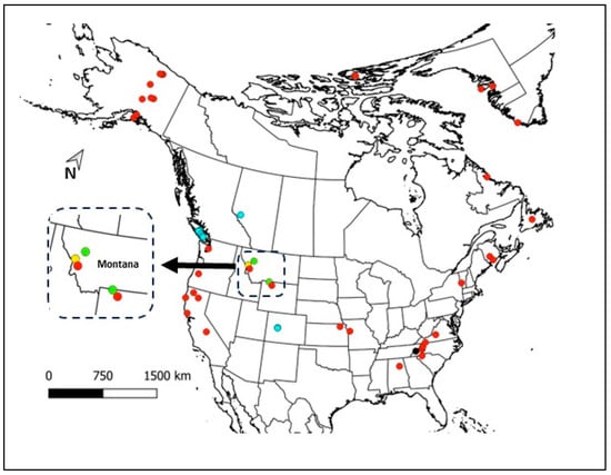 North American records of the genus Platicista. Red dots = Pla. angustata, light blue dots = Pla. cheleusis, green dots = Plal. brunsoni, black dot = Pla. horribilis, yellow dot = Pla. loloensis nov. sp. Locations taken from the work of Kaczmarek et al., 2016 [].