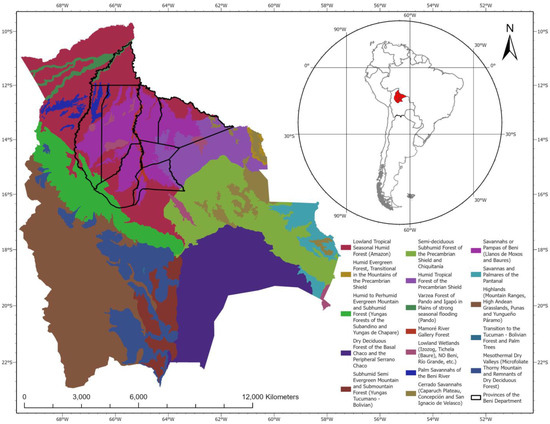 - Ibisch, P.L.; Beck, S.G.; Gerkmann, B.; Carretero, A. Ecoregiones y ecosistemas. In Biodiversidad: La Riqueza de Bolivia; Ibisch, P.L., Me, G., Eds.; Editorial FAN: Santa Cruz de la Sierra, Bolivia, 2003; pp. 47–88. [Google Scholar]