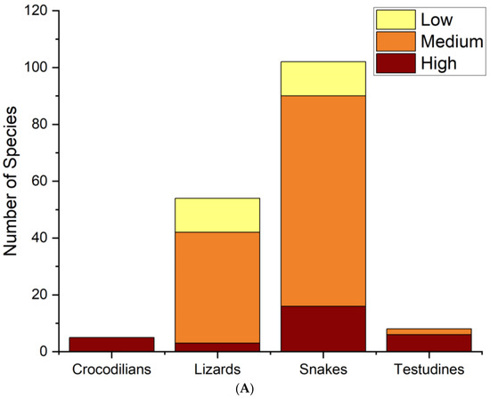 - Böhm, M.; Collen, B.; Baillie, J.E.M.; Bowles, P.; Chanson, J.; Cox, N.; Hammerson, G.; Hoffmann, M.; Livingstone, S.R.; Ram, M.; et al. The conservation status of the world’s reptiles. Biol. Conserv. 2013, 157, 372–385. [Google Scholar] [CrossRef]