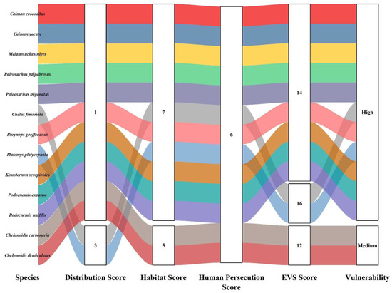 | Crocodilia | Alligatoridae | Caiman crocodilus | (Linnaeus, 1758) | 1 | 7 | 6 | 14 | High | LC | Stable |