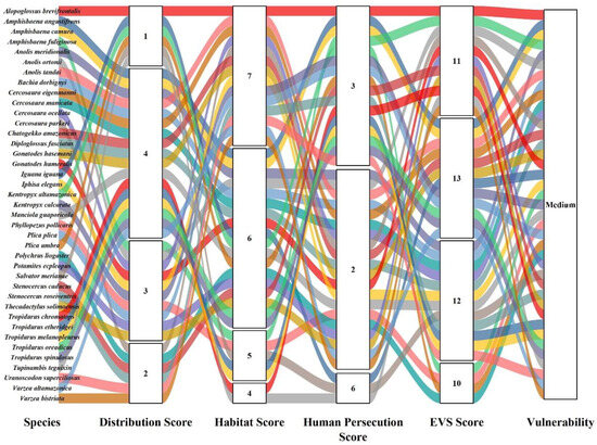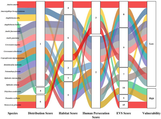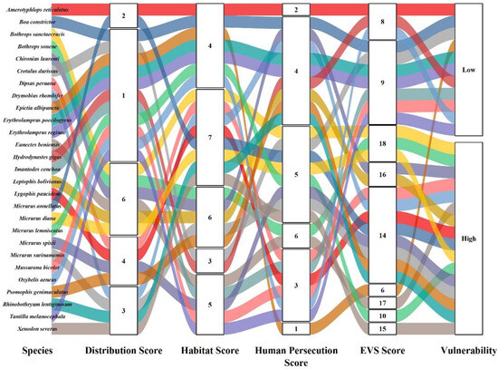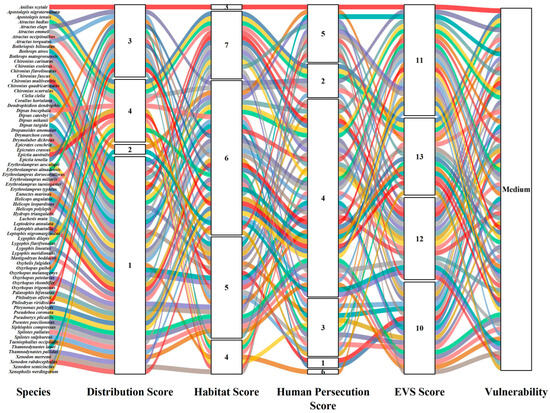 | Order | Family | Species | Authority | DS | HS | HP | EVS | Vulnerability | IUCN | Pop. Status |