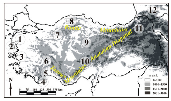 Sampling localities. 1. Kazdağları; 2. Lesvos Island; 3. Spil Mountain; 4. Adrasan; 5. Beydağları; 6. Burdur; 7. Kartalkaya; 8. Küredağları; 9. Yozgat; 10. Aladağlar; 11. Artvin; 12. Caucasus. See Supplementary S1 for coordinates and other details. The main mountain ranges are also indicated.