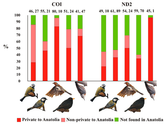 Percentage of COI and ND2 haplotypes private to Anatolia, found in Anatolia and found in other Western Palaearctic regions (i.e., non-private to Anatolia) and not found in Anatolia in Eurasian blue tit, great tit, Eurasian chaffinch, Eurasian blackbird and Krüper’s nuthatch (left to right). Numbers on top of the columns indicate sample size within (left) and outside (right) Anatolia. Pictures not to scale.