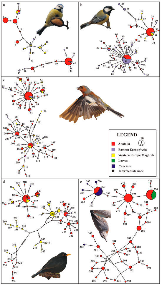 COI and ND2 (top and bottom left, respectively) median-joining network of target species: (a) Eurasian blue tit; (b) great tit; (c) Eurasian chaffinch; (d) Eurasian blackbird; (e) Krüper’s nuthatch. A scale to infer the number of sequences (i.e., individuals) for each haplotype (1–308) is provided; mutational steps are indicated by hatch marks. See Supplementary S1 for coordinates and other details.