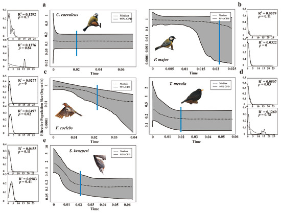 Extended Bayesian Skyline Plots (EBSPs) based on COI and ND2 of Anatolian populations of the five species included in this study: (a) Eurasian blue tit; (b) great tit; (c) Eurasian chaffinch; (d) Eurasian blackbird; (e) Krüper’s nuthatch. Median estimates of effective population size (Ne) are given. The dotted line and the grey area delimit the 95% central posterior density (CPD) intervals. The x-axis represents time from the present in million years (Myr), while the blue line indicates the Last Glacial Maximum. Panels on the left evidence mismatch distributions to expected frequencies under the demographic expansion model (top: COI; bottom ND2).