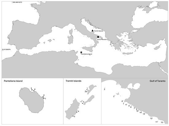 Map of the areas investigated in the Mediterranean Sea, searching for living specimens of Pinna nobilis. Pantelleria Island—1 Faraglione, 2 Cala Tramontana, 3 Secca di Campobello, 4 Baia di Campobello. Tremiti Islands—1 Secca della Vedova West side, 2 Secca della Vedova East side, 3 Canale Travicello, 4 Cala del Sale, 5 Scoglio dell’Elefante. Gulf of Taranto—1 San Vito, 2 San Pietro Island, 3 Secca dell’Armeleia, 4 Lido Bruno, 5 Lama, 6 San Vito, 7 Mon Reve, 8 Saint Bon, 9 Lido Gandoli, 10 Saturo, 11 Le Conche, 12 Torre Zozzoli, 13 Monte d’Arena, 14 Baia d’Argento, 15 Torre Ovo.