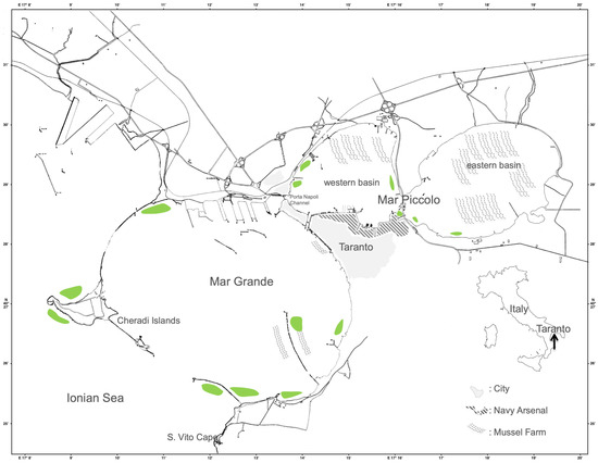 Map of the Taranto marine area. The green blocks indicate the distribution of living Pinna nobilis populations until 2018.